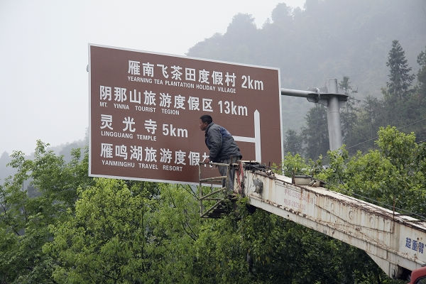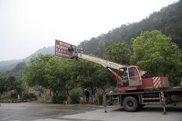 专用外部交通标识”的要求,近日我度假村在雁洋镇大坪村雁南飞山门入口处安装旅游景区专用的“褐底白字”路标指示牌。图为安装工人正在安装指示牌: