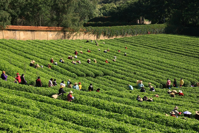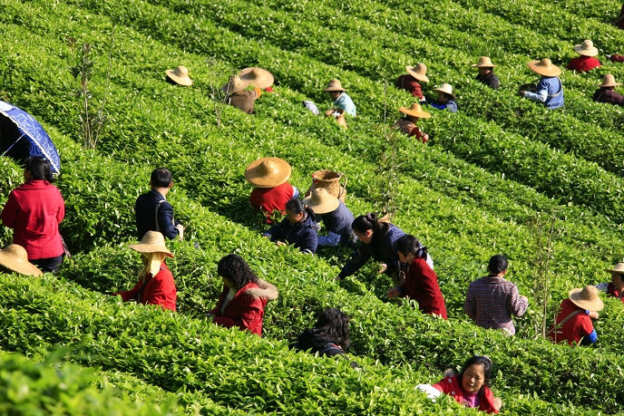 三八国际妇女节适逢春茶的采摘季节,前来雁南飞茶田景区的妇女游客迎着春天温暖的阳光,兴致勃勃在茶田里采茶,成为景区一道亮丽的流动风景。