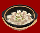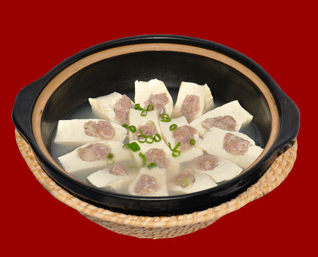 材 料:豆腐,猪肉,香菇,盐,水等。 做 法:猪肉剁成泥,加香菇、葱、淀粉、胡椒粉、搅成胶状馅,豆腐切块,中间放入馅,锅置中火加油烧至七成热,将豆腐放入煎呈金黄色,另锅放入上汤、盐、酱油、猪油煮沸,将煎好的豆腐倒入煮5 分钟出锅,置于碗内倒入余汁,上屉蒸5 分钟,取出合在盘内,加水淀粉勾芡浇在豆腐上,淋上香油,撒上胡椒粉即成。 口 感:客家酿豆腐把豆腐和肉完美地结合在一起,解决了“两者不可得兼”的矛盾。酿豆腐的肉馅深入豆腐之内,一口下去,豆腐的清香和肉馅的浓香在口腔内融合交汇,那种滑软鲜嫩的口感堪称“完美”。 |