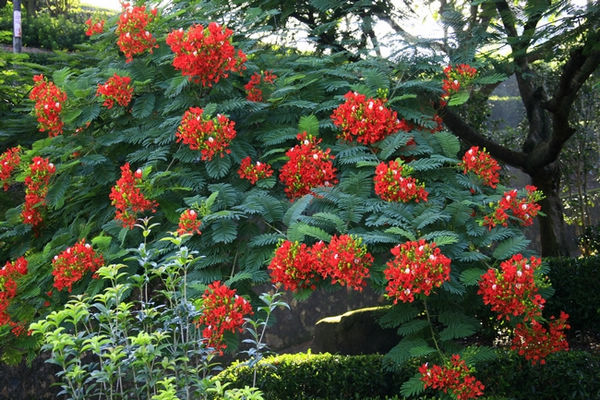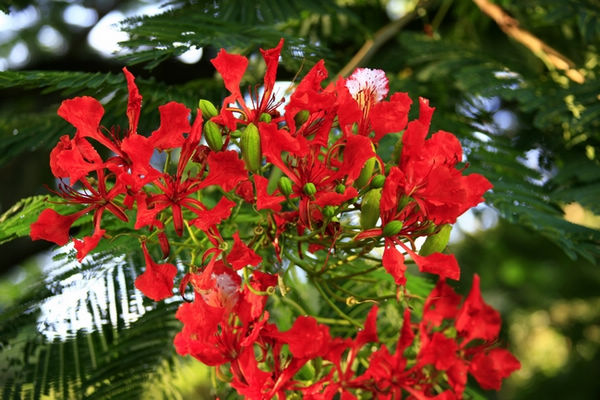 凤凰木(学名:Delonix regia)又名凤凰树、凤凰花、火凤凰、红花楹等,为豆科凤凰木属的植物,花期为5至7月,花开时满树结花,花色鲜艳如火,火红的凤凰花,就像一团一团的火凤凰的羽毛,布满树梢,与绿叶相映成趣,叫人怜爱,使人着迷。