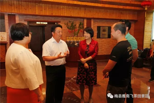 梅州雁南飞茶田有限公司总经理谢斌向梅州市人民政府副市长张晨汇报活动筹备情况。