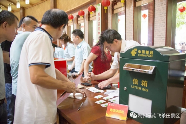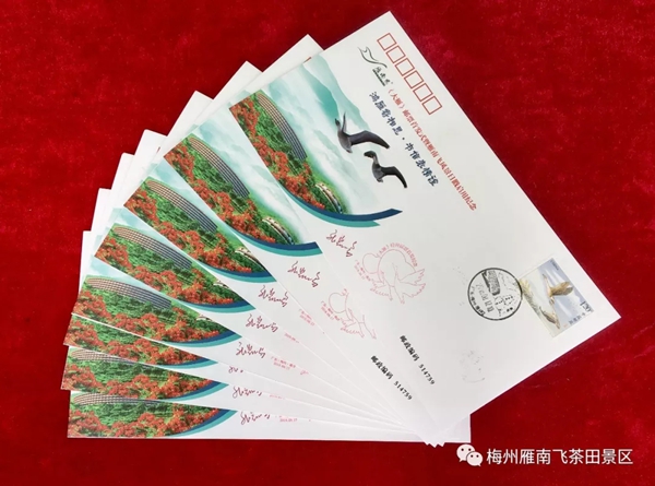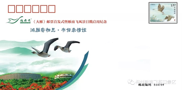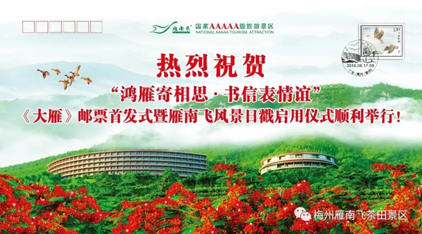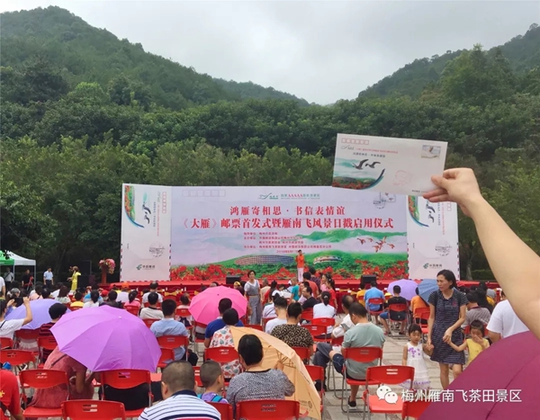 8月17日,由梅州市旅游局指导,中国邮政集团公司梅州市分公司、梅州市旅游协会、梅州市集邮协会主办,梅州雁南飞茶田景区、中国邮政集团公司梅县区分公司承办的主题为“鸿雁寄相思 书信表情谊”——《大雁》邮票首发式暨雁南飞风景日戳启用仪式在梅州雁南飞茶田景区游客中心广场隆重举行。 本次活动举行了《大雁》邮票首发纪念封揭幕以及梅州雁南飞茶田风景日戳启用仪式,吸引了来自中华全国集邮联合会、广东省集邮协会、中国邮政集团公司广东省分公司、梅州市旅游局、梅州市邮政管理局以及广大集邮爱好者、游客朋友们共800多人参加活动。