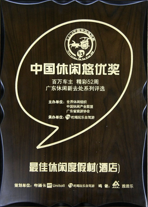由世界休闲组织、中国休闲产业联盟、中国汽车流通协会自驾游管理办公室、广东省旅游协会、广东联合电子收费股份有限公司联合主办的“2008中国休闲悠优奖——广东休闲新去处”系列评选活动于2009年1月揭晓。雁南飞茶田以浓郁的客家文化展示和细致周到的服务获得广大自驾车主的一致认可,荣获“最佳休闲度假村”的称号,特此祝贺。