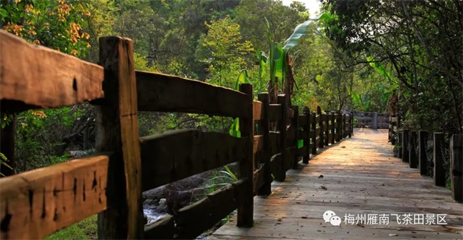 木栈道全长约2公里,缘溪而上,沿途经春、夏、秋、冬四个各具季节特色、古色古香的供游人休憩观赏的亭台,终点为养生谷,每座山谷景色各异,各具韵味。春谷内鲜花满山、绿草盎然,显得生机勃勃;夏谷内枝繁叶茂、古树成荫,显得清静幽远;秋谷内草木凋零、落叶萧萧,显得萧瑟肃穆;冬谷内薄雾氤氲、漫山含霜,显得万籁寂寥;养生谷内百年古藤虬曲蟠卷、细流泉水叮咚作响,树木繁荫树影斑驳,让人宛若身处人间仙境。