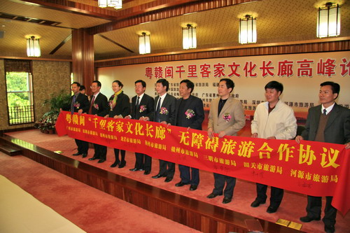12月8日下午,由广东省旅游局、江西省旅游局、福建省旅游局共同主办,梅州市人民政府、惠州市人民政府承办的“粤赣闽千里客家文化长廊”高峰论坛在国家4A级旅游区--雁南飞茶田举行。三省旅游界有关领导、专家聚首一堂,就共同打造“粤赣闽千里客家文化长廊”旅游品牌积极献策。此次高峰论坛上,三省共同发布了粤赣闽“千里客家文化长廊”区域旅游合作宣言,并举行了粤赣闽无障碍旅游签约仪式。