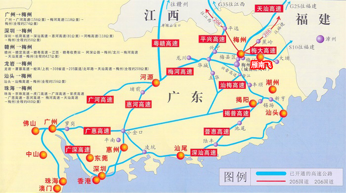 梅州——珠三角经济区: 广州(白云山、宝墨园、长隆旅游度假区、花城广场、广州塔、陈家祠、沙面、圣心大教堂), 深圳(世界之窗、欢乐谷、东部华侨城、大小梅沙、中英街、大鹏所城), 东莞(孙中山先祖故居、粤晖园、虎门炮台、袁崇焕纪念园、松山湖、可园), 珠海(长隆海洋王国、珠海渔女雕像、情侣路、海泉湾、珠海大剧院), 佛山(祖庙,清晖园,西樵山,长鹿农庄,岭南天地,史卢比主题公园,南风古灶), 中山(孙中山故里、孙文西路步行街、岐江公园、中山城), 惠州(惠州西湖、罗浮山、平海古城、南昆山、叶挺故居、归善县学宫)。