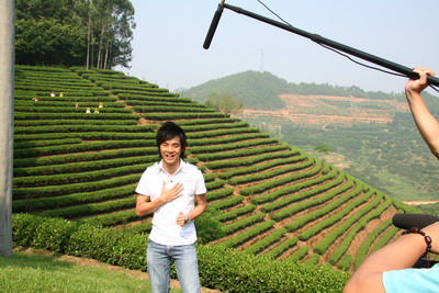 9月15日,南方电视台卫星频道《潮流假期》节目组为拍摄梅县旅游宣传片,来到我景区——雁南飞茶田拍摄场景。图:南方电视台节目主持人正在为拍摄场景做宣传介绍。