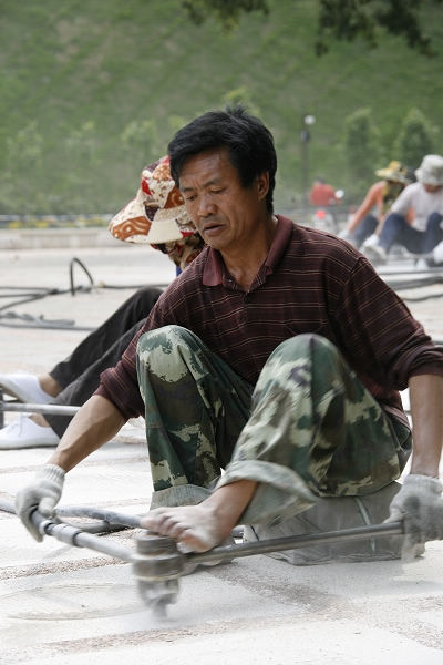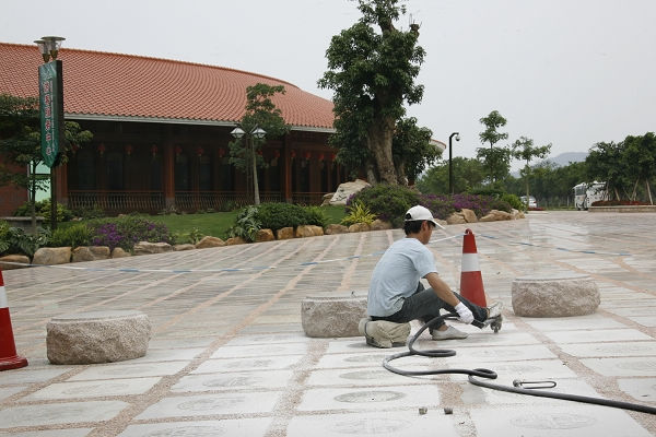 为创建国家5A级旅游景区,我景区对景区入口处铺设的石板进行防滑处理。图为施工人员正在进行施工作业: