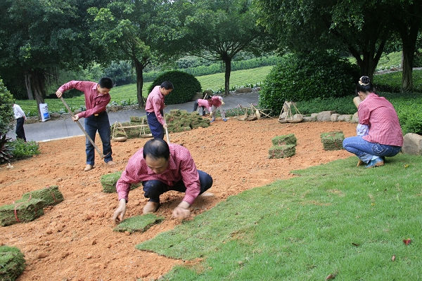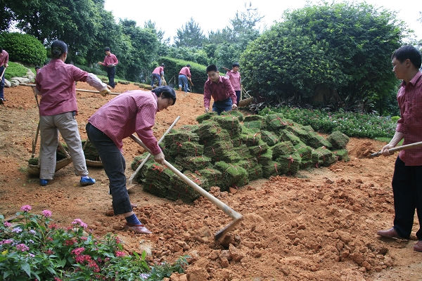 图为绿化工人正在铺设草皮