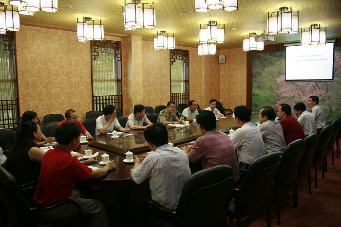 图为省市领导在听取景区工作人员的创建工作情况汇报