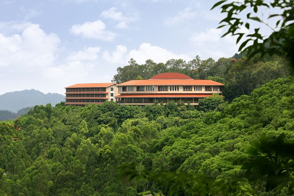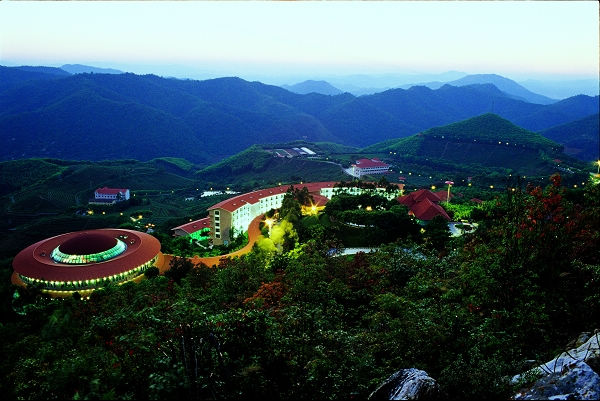 每次到一个地方度假,我总是要找一间舒适的房间。我们下榻的酒店是景区环保型的五星级围龙大酒店。围龙屋是客家人的传统民居,富实用性与传奇色彩,围龙大酒店,从意义上说只是保留了围龙屋的神韵罢了,六层楼高的大酒店,置身于几万亩的茶田中,给人一种高贵的,君临天下的感觉。也许它不是最豪华的,但肯定是最具格调与个性化的,暖色的外墙与周围一望无际的绿,显得那么地相宜。