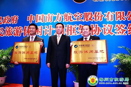 南航股份公司党委书记张子芳向雁南飞茶田景区、雁鸣湖旅游度假村授予“南航旅游休闲基地”牌匾。