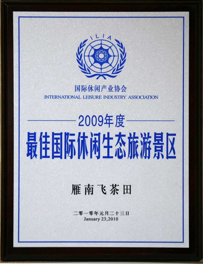 近日,由国际休闲产业协会和中国人民大学休闲经济研究中心联合主办的“国际休闲产业论坛2010年会”在北京召开,年会围绕“休闲全民化的商机与挑战”为主题,雁南飞茶田景区以突出的休闲概念和时尚、健康、绿色的定位,精益求精的管理理念和良好的旅游品牌形象,良好的自然生态环境,丰富的客家文化和茶文化内涵,经中国人民大学休闲经济研究中心组织专家评审,获得了“2009年度国际最佳生态休闲景区”荣誉称号,特此祝贺!
