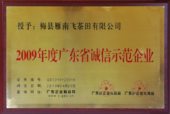 2009年,我公司全体员工深入贯彻落实科学发展观,加快转变经济发展方式,抢抓机遇、赢得创新,扎实推进企业诚信建设,经广东省企业联合会以及广东省企业家协会一致决定,授予梅县雁南飞茶田有限公司“2009年度广东省诚信示范企业”荣誉称号,特此祝贺!
