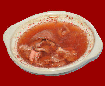材 料:猪肝、瘦肉、猪粉肠、枸杞叶、咸菜、酒曲等。 做 法:将猪肝、瘦肉切成薄片,猪粉肠刮净,肠内异物洗净,切成段,把切好瘦肉拌入薯粉。起镬放入汤水,加咸菜、糟汁待汤水滚沸时再加入猪肝、瘦肉、粉肠调味,滚煮到刚熟时上碗即成。 口 感:肉质爽滑,汤汁鲜美,营养丰富,是众多客家人喜爱的一道特色美味汤。 |