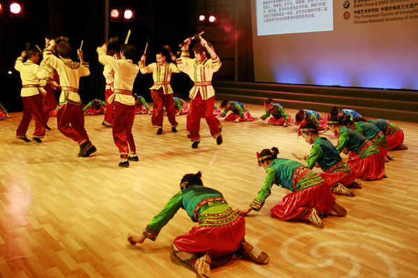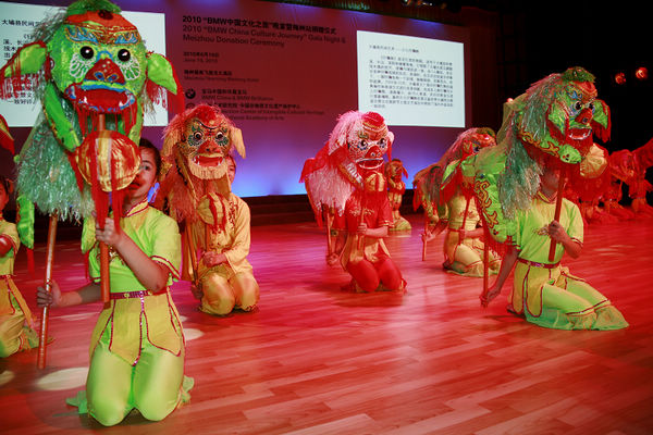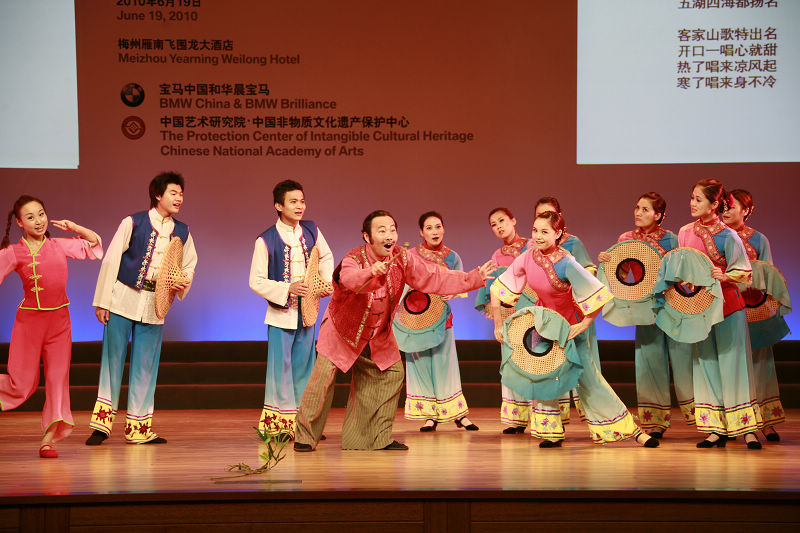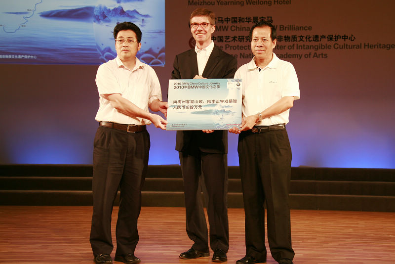 由宝马汽车有限公司和中国艺术研究院及中国非物质文化遗产保护中心共同组织的“2010BMW中国文化之旅”活动,23部宝马汽车载着中央及地方媒体、非物质文化遗产专家及宝马车主,从上海世博园出发,经上海、浙江、福建、广东四省进行非物质文化遗产探访,历时10天,行程2200多公里,终点站为梅州雁南飞茶田景区,昨天晚上在雁南飞围龙大酒店举行大型捐赠庆祝晚宴,晚宴过程中进行了精彩的非物质文化遗产歌舞节目表演。