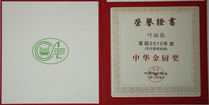 热烈祝贺我公司叶祖根总经理荣获2010年度“中华金厨奖”荣誉称号,叶祖根总经理是广东省烹饪协会副会长、梅州市餐饮行业协会会长。多年来,雁南飞茶田在叶祖根总经理的带领下,坚持突出客家饮食文化特色,致力弘扬客家饮食文化品牌,创制出既有健康养生,又有文化品味内涵的特色客家菜,成为梅州餐饮行业的领头雁。