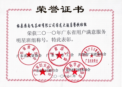 根据广东省质量协会、广东省总工会、共青团广东省委员会、广东省妇女联合会、广东省科学技术协会文件(粤质协字[2010]33号)《关于表彰荣获2010广东省用户满意服务明星的决定》,雁南飞围龙大酒店餐饮班组被评为2010年广东省用户满意服务明星班组。
