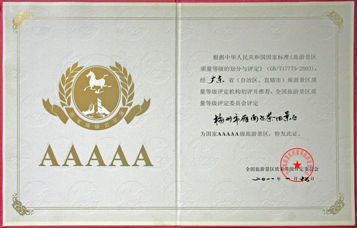 国家旅游局下发(旅发[2011]1号)文件,依照中华人民共和国国家标准《旅游景区质量等级的划分与评定》与《旅游景区质量等级评定管理办法》,经有关省、自治区、直辖市旅游景区质量等级评定委员会推荐,全国旅游景区质量等级评定委员会组织评定,广东省梅州市梅县雁南飞茶田景区达到国家5A级旅游景区标准的要求,批准为国家5A级旅游景区,成为全国97家5A景区广东4家其中的一家 ,特此祝贺。