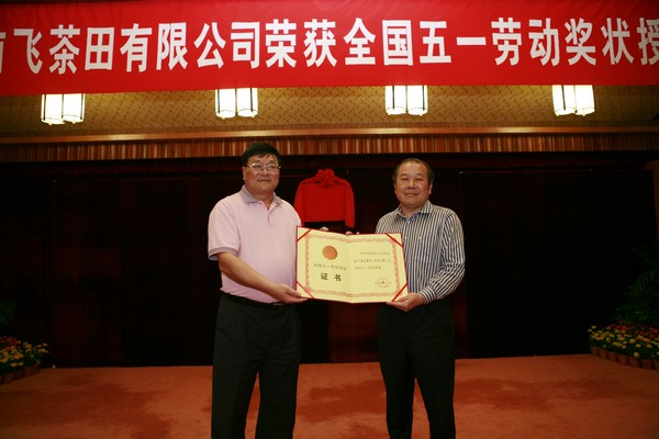 2011年04月29日上午,广东省庆祝“五一”国际劳动节暨劳动模范表彰大会在广州隆重召开。大会向今年受表彰的19个全国五一劳动奖状、70名全国五一劳动奖章、50个全国工人先锋号的集体和个人代表及179名广东省五一劳动奖章和198个广东工人先锋号获得者代表颁奖。梅县雁南飞茶田有限公司荣获“全国五一劳动奖状”荣誉称号,叶林副总经理代表雁南飞茶田有限公司出席表彰大会并领奖。