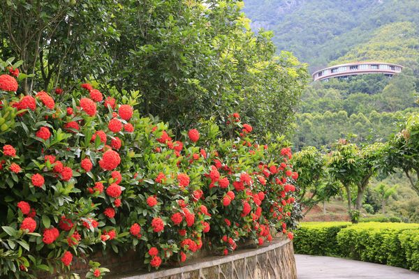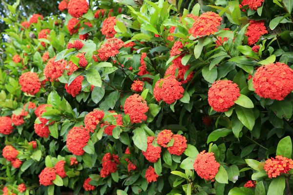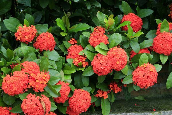 山丹花又称为仙丹花、龙船花,就是俗称矮仙丹的常绿灌木。其他还有红绣球、买子木、卖子木、三段花等别名。英文名称为Chinese ixora,正式学名为Ixora chinensis。山丹花全株侧枝向上挺直生长且平滑,叶子表面光滑革质对生,全缘而呈倒卵形状或是椭圆形。一般长度约9厘米-12厘米左右,宽约4厘米-5厘米。表面是深绿色,背面的颜色较浅。而洋山丹花的叶片形状则呈托叶三角形或长椭圆形,表面的叶脉比较明显。叶子的出梢期第一次大约在每年的3月-6月之间,第二次约在8月到10月上旬左右。