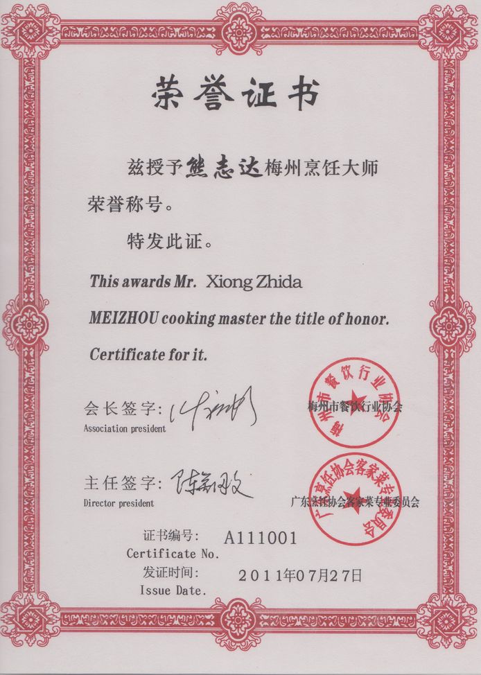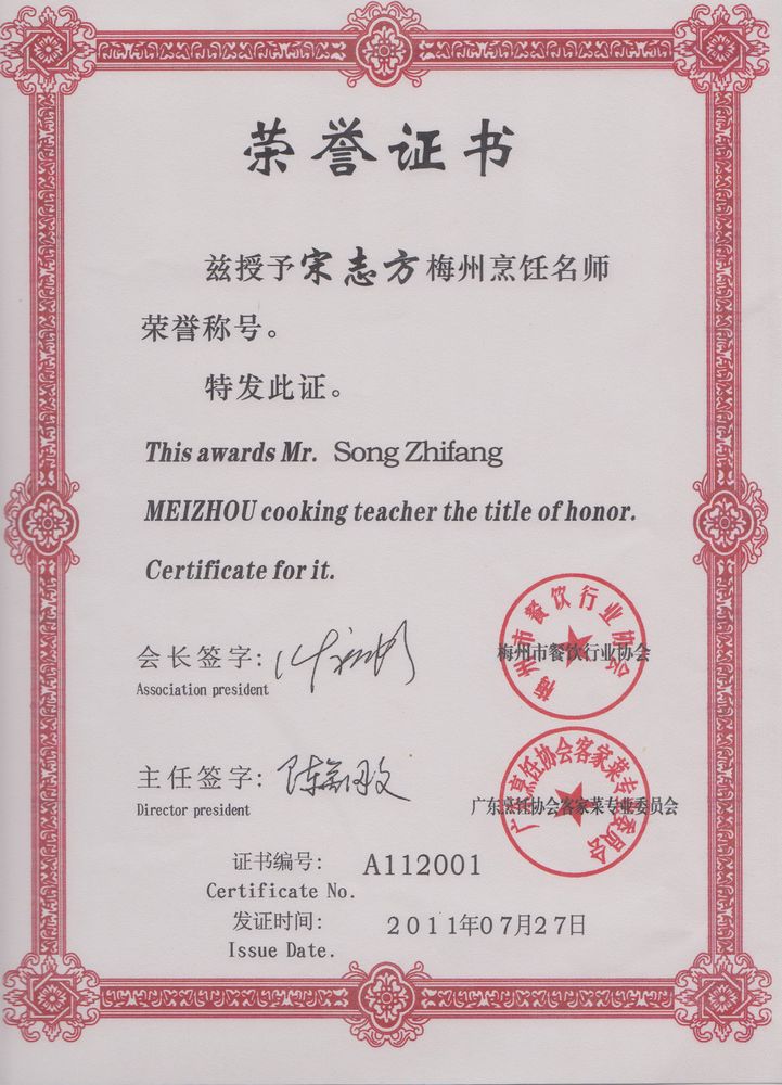 7月27日,雁南飞茶田有限公司又传佳音,我公司行政总厨熊志达、行政副总厨宋志方两人被梅州市餐饮行业协会、广东烹饪协会客家菜专业委员会联合授予梅州市烹饪名师荣誉称号。特此祝贺!