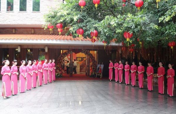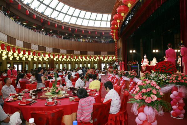 围龙食府整体建筑坐落在满是丛林绿地的山坡上,平面呈圆型布局,就像一座现代版的客家围龙屋。围龙食府于2003年建成,建筑共计3,总面积4800平方米,2004年获得中国建筑最高荣誉“全国建筑工程鲁班奖”。巨大的红色穹顶远看好似静卧的飞碟吸引着观光客的眼球,红色的墙体、圆形围龙屋设计寓意着团团圆圆,大厅的屋顶更是用99999根竹子粘成,象征着美满的爱情天长地久。宽敞明亮的大厅非常适合举办大型婚宴,专业的表演舞台配备了国内最为先进的音响和灯光系统,每天还有雁南飞山歌艺术团的专业演员们在这里表演,为您的婚宴活动增加喜庆的气氛。其独特的建筑设计非常适合举办大型会议、宴会、服装秀及专业的演出活动。
