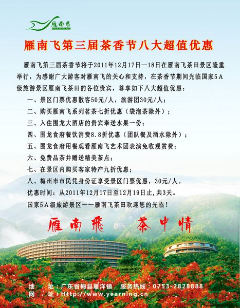 雁南飞第三届茶香节将于2011年12月17日—18日在雁南飞茶田景区隆重举行,为感谢广大游客对雁南飞的关心和支持,在茶香节期间光临国家5A级旅游景区雁南飞茶田的各位贵宾,尊享如下八大超值优惠: