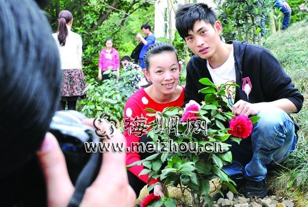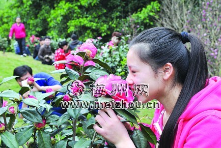 绚丽多姿的茶花引来游人纷纷与之合影