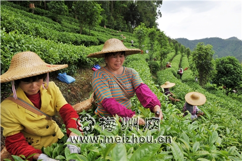 阳春三月,在全国“三高”农业标准化示范区——雁南飞茶田,满目青翠,空气中弥漫着淡淡茶香。目前,春茶已进入采摘期,雁南飞每天都有数百名采茶工人在茶园中采摘春茶(如图 )。( 钟小丰 罗莉玲 摄)