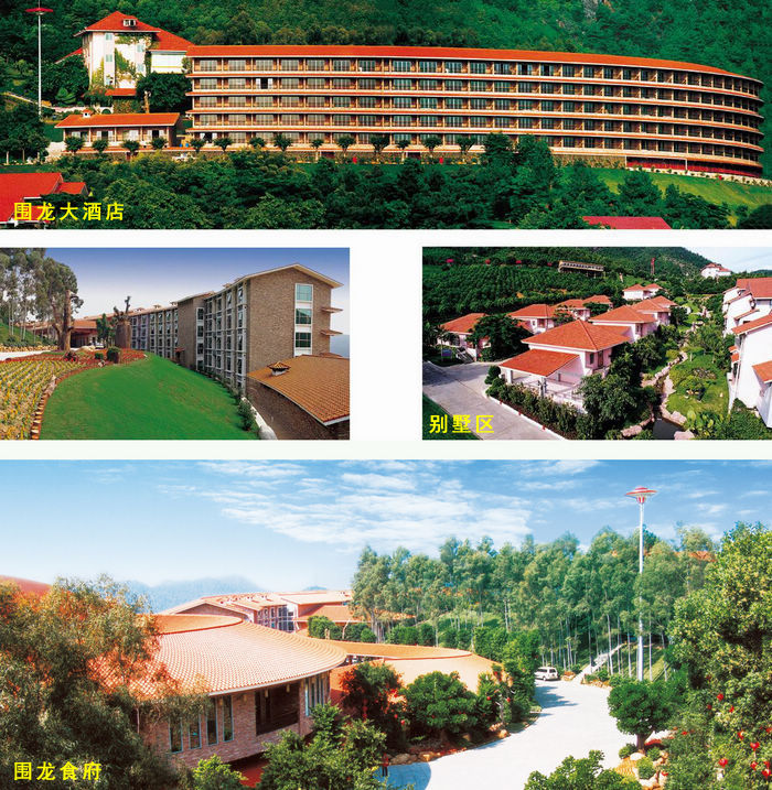 获得国内建筑界最高荣誉,——鲁班奖的围龙大酒店,采用了反围龙屋的半圆形建筑结构,酒店充分突出自然生态和茶田风光、客家文化和茶文化的特色。舒适的客房,匠心独运,结构精妙,用料之至,充分体现了围龙大酒店是一间具有典型特色的度假型酒店。 按客家土楼的建筑结构建造的围龙食府出品客家盐焗鸡、农家梅菜扣肉等传统客家菜,并新创了香茶炖鸡、茶香包、茶香水晶卷等特色菜点。客家小吃有蒸笑粄、味酵粄、三及第汤、客家腌面等各种特色小吃,并提供24小时餐饮服务。
