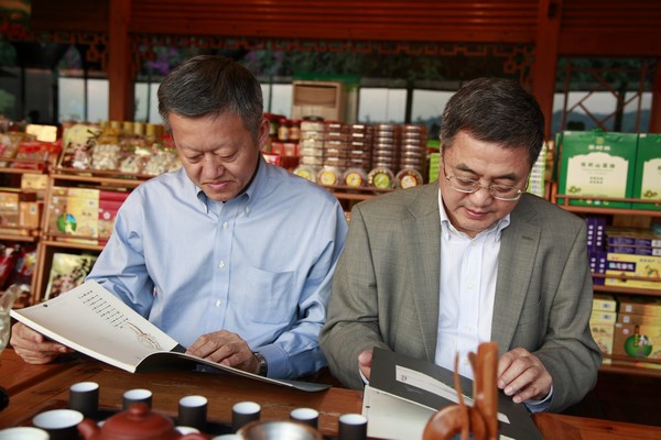 梁庆寅(左)、陈春声品读雁南飞茶文化画册