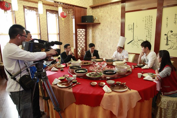 雁南飞行政总厨(右三)向南方卫视摄制组解说“十大客家健康美食”的制作工艺