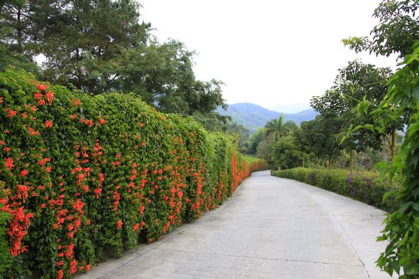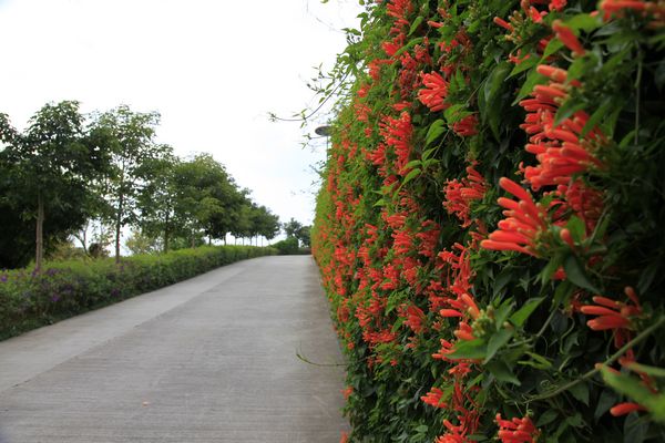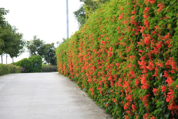 入冬时节,朵朵金黄色的炮仗花,星星点点地点缀在雁南飞百米长的绿墙上,就像一串串迎春的鞭炮,又仿佛一颗火星似地“炸”成一片,给雁南飞增添了许多喜庆的色彩。