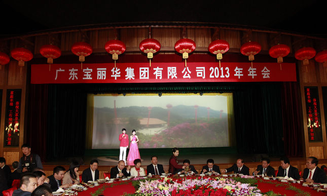 2月1日晚,广东宝丽华集团有限公司在雁南飞围龙食府隆重举行2013年新年年会,宝丽华集团下属各阶层干部员工共聚一堂,共贺蛇年新春的到来。年会由宝新能源董事长宁远喜主持,广东宝丽华集团有限公司叶华能主席在会上致辞。叶主席在总结宝丽华集团2012年成绩,展望2013年之余,更和员工一起温习了宝丽华集团格言文化。