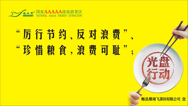在全国各地区厉行勤俭节约、反对铺张浪费的社会大浪潮下,国家5A级旅游景区——梅县雁南飞茶田景区在全力做好旅游接待服务工作的前提下,积极响应党和国家的号召,对勤俭节约行动躬身践行。 作为中华餐饮名店、广东省餐饮协会会员单位的雁南飞围龙食府积极响应省文明办 “加入光盘行动,拒绝舌尖浪费” 的号召,推出“半份菜”、“小份菜”、“热菜拼盘”、“免费打包”等措施,倡议顾客“吃不完兜着走”。围龙食府餐饮服务人员还在餐桌醒目位置放置了温馨提示卡,引导消费者摒弃好面子、讲排场、摆阔气的陋习,让适度点餐、文明消费、杜绝舌尖浪费的观念深入人心;此外,专门制订了拼盘菜单、给打包的顾客提供打包食品注意事项提示条,用实际行动加入到“光盘行动”中。据不完全统计,蛇年春节期间,围龙食府厨餐垃圾比往年同比减少了50%以上。 倡勤俭节约,禁铺张浪费,雁南飞在行动。