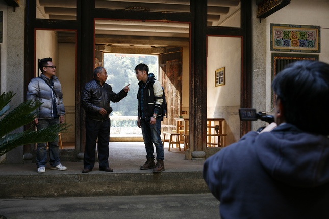 桥溪村著名客家传统民居建筑——继善楼,其主人(左二)正给节目组讲述继善楼的故事。