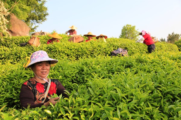 走进雁南飞,只见层层叠叠的茶田里,茶叶新芽娇嫩欲滴,200多名采茶女头戴斗笠,采摘嫩芽,收获今年的第一批春茶。