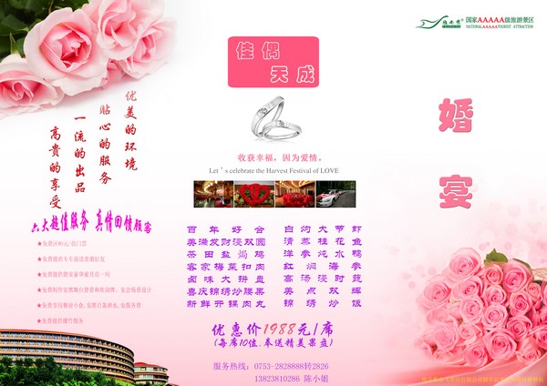 六大超值优惠 ★ 免景区80元/位门票; ★ 免费提供专车接送亲朋好友(梅州城区范围内); ★ 免费提供婚宴豪华蜜月房一间一晚和次日双人自助早餐; ★ 免费制作宴席舞台背景和欢迎牌、宴会场景设计; ★ 免费享用餐前小食和奉送精美果盘,宴席自备酒水,免服务费; ★ 免费提供爆竹。