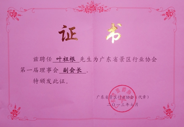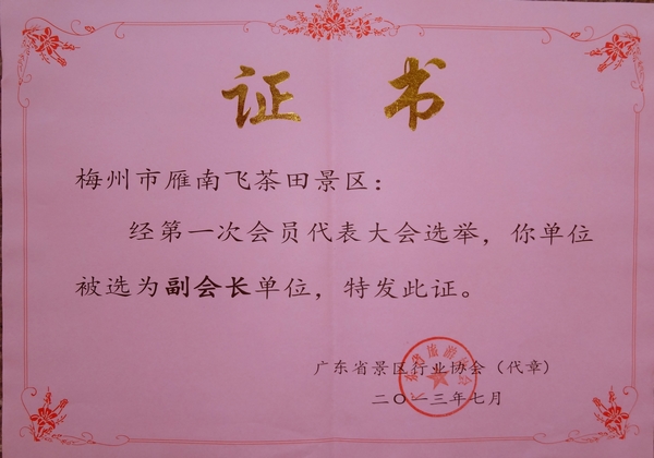 7月24日,由广东省旅游协会牵头发起筹备的广东省景区行业协会第一届会员代表大会在清远聚龙湾天然温泉度假村国际会议中心2楼隆重举行。广东省旅游局副局长张振林、清远市副市长何国森等省、市、县相关部门领导及省内旅游业界嘉宾300余人出席会议。会议由广东省旅游协会副秘书长张建彬主持。 会议期间,省社会组织管理局领导宣读同意筹备文件,广东省旅游协会领导代表景区行业协会筹备委员会作工作报告,与会人员举手表决通过筹备委员会工作报告、《广东省景区行业协会章程》。接着,与会人员以无记名投票的方式选举并产生了景区行业协会第一届理事会会长、副会长、监事长、秘书长、理事.梅县雁南飞茶田景区推选为副会长单位,总经理叶祖根当选为副会长。