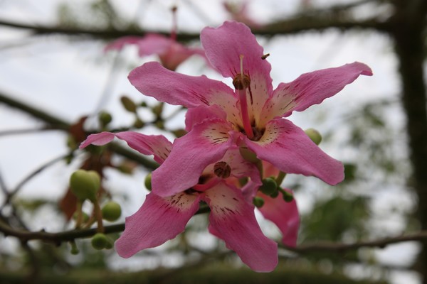 时下正值立秋节气,天气微凉,然而雁南飞茶田景区却一派繁花似锦,游客中心周围种植的美丽异木棉树花正怒放,美丽的景象让游客流连忘返,成为一道独特的风景,给游客留下了深刻印象。一树树或粉红的美丽异木棉树,正迎着温暖的阳光,有的吐艳芬芳,有的含苞待放,灿烂的景象煞是好看。