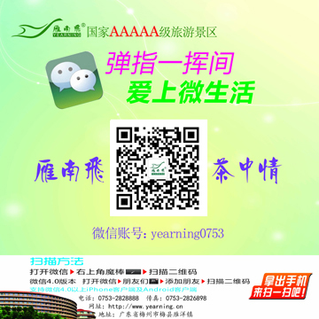 雁南飞茶田景区官方微信正式发布,输入微信号:yearning0753或扫描下图二维码即可关注。我们将竭诚为您提供最优美的环境,最优质的服务,最难忘的旅途!雁南飞欢迎您!