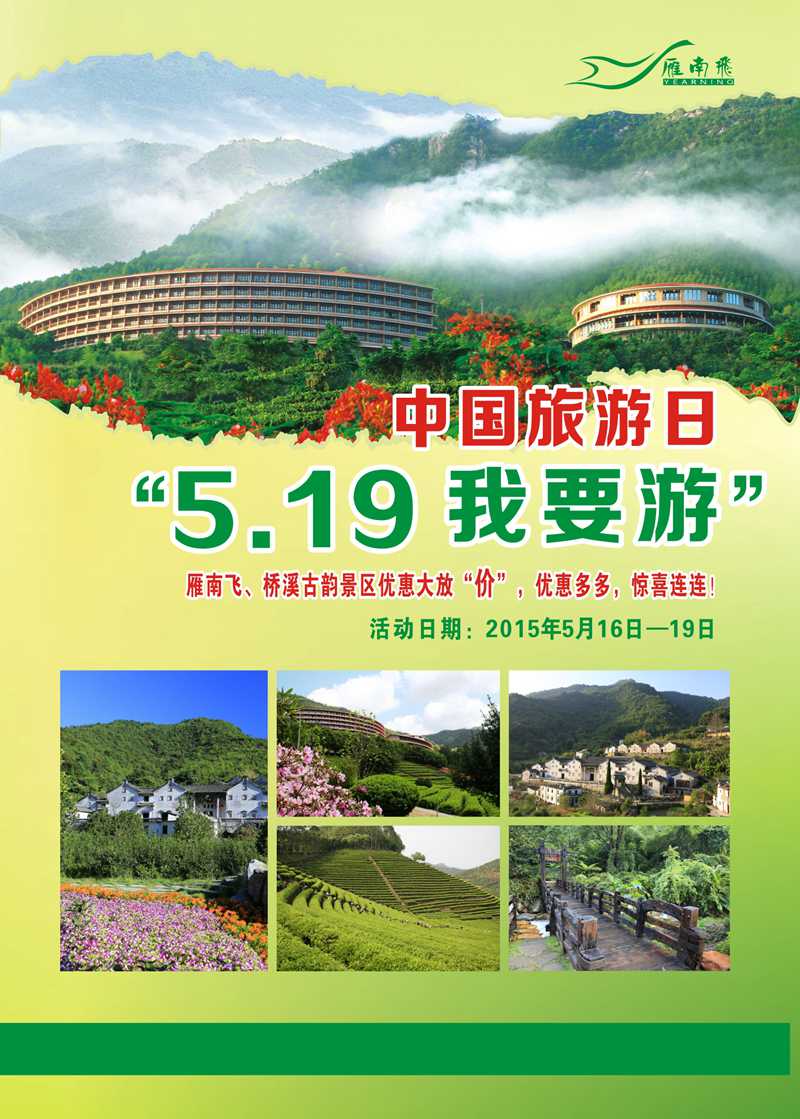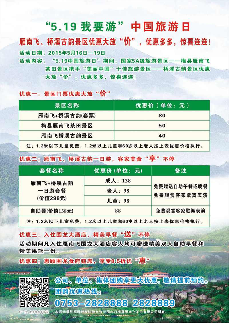 活动内容:“5.19中国旅游日”期间,国家5A级旅游景区——梅县雁南飞茶田景区携手“美丽中国”十佳旅游景区——桥溪古韵景区优惠大放“价”,优惠多多,惊喜连连!单位、公司、集体团购享更大“优惠”哟!团购优惠热线:0753-2828888、2828889。