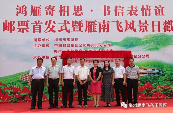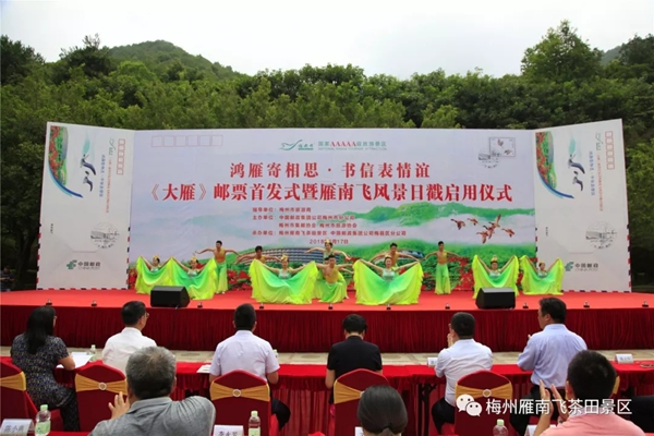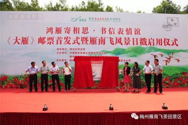 8月17日,由梅州市旅游局指导,中国邮政集团公司梅州市分公司、梅州市旅游协会、梅州市集邮协会主办,梅州雁南飞茶田景区、中国邮政集团公司梅县区分公司承办的主题为“鸿雁寄相思 书信表情谊”——《大雁》邮票首发式暨雁南飞风景日戳启用仪式在梅州雁南飞茶田景区游客中心广场隆重举行。 本次活动举行了《大雁》邮票首发纪念封揭幕以及梅州雁南飞茶田风景日戳启用仪式,吸引了来自中华全国集邮联合会、广东省集邮协会、中国邮政集团公司广东省分公司、梅州市旅游局、梅州市邮政管理局以及广大集邮爱好者、游客朋友们共800多人参加活动。
