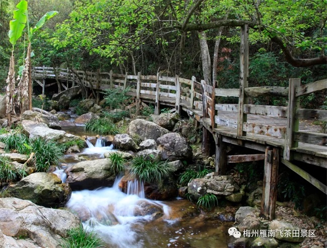 木栈道全长约2公里,缘溪而上,沿途经春、夏、秋、冬四个各具季节特色、古色古香的供游人休憩观赏的亭台,终点为养生谷,每座山谷景色各异,各具韵味。春谷内鲜花满山、绿草盎然,显得生机勃勃;夏谷内枝繁叶茂、古树成荫,显得清静幽远;秋谷内草木凋零、落叶萧萧,显得萧瑟肃穆;冬谷内薄雾氤氲、漫山含霜,显得万籁寂寥;养生谷内百年古藤虬曲蟠卷、细流泉水叮咚作响,树木繁荫树影斑驳,让人宛若身处人间仙境。
